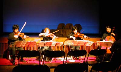 | 12月4日(木)〜12月6日(土)に高円寺で行われた3人芝居、 「AntiqueHotel Orchestra World」の客入れ、客出しの演奏をさせていただきました。 タナカ知ラズにヴィオラとチェロを加えたカルテットでの演奏となりました。 公演は4回行われたのですが、我々が担当したのは12月4日(木)及び12月6日(土) 昼の部の2回です。演奏は開場から開演までの30分強と、終演後10分程度行いました。 4日(木)のメンバーはひなた(1stヴァイオリン)、かとぅー(2ndヴァイオリン)、 佐藤潤一(ヴィオラ)、鳩山紀一郎(チェロ)でした。 6日(土)のメンバーはひなた(1stヴァイオリン)、かとぅー(2ndヴァイオリン)、 佐藤潤一(ヴィオラ)、吉田悠亮(チェロ)です。 本編の演劇もとてもおもしろかったです。 左から久松信美さん、亜比流アツ男さん、脇坂圭一郎さん。 (演劇本編の写真は照明の湯山和弘さんのページでもっと見れます。) 本編終了後、出口付近で客出し演奏もしました。 僕たちの演奏が演劇本編終了の合図のようなものだったので、それと同時に拍手がなりました。 演奏を始めた時に拍手、というのは初めての経験で、とても新鮮でした。 楽しかったです! AHOWキャストの皆さんをはじめ、スタッフの皆さん、各関係者の皆さん、演劇を見にいらした のに、我々の演奏をご静聴くださり、かつ温かい拍手まで下さったお客様方、本当にありがとう ございました。 今回の公演の詳細はこちらです。 打ち上げの様子はこちら |